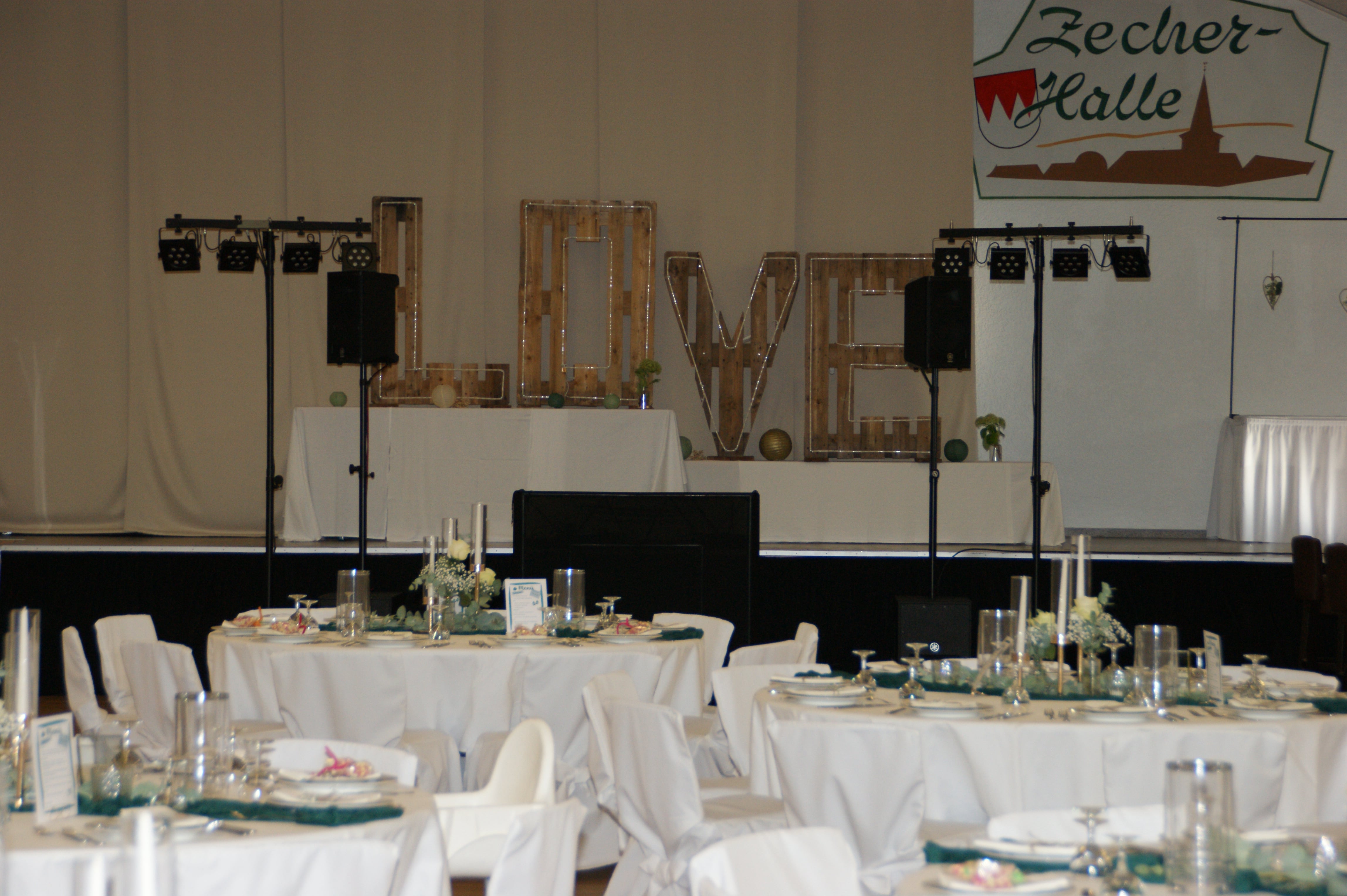 Hier finden sie einige Beispiele für Hochzeiten in der Zecher-Halle.Es gibt viele Möglichkeiten die Halle nach eigener Vorstellung zu gestalten. Wir helfen gerne dabei ihren Traum zu verwirklichen.